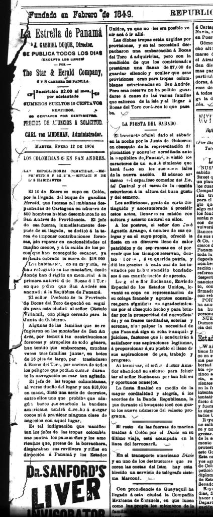 Just two months after the secession, rumors and then newspapers reported that the Colombian soldiers stationed at San Andrés had abused islanders demanding they pay greater taxes to support their presence on the island. By January 1904, newspapers in Panama and the United States reported the arrival of San Andrés islanders in Bocas del Toro, one island among several a part of a Panamanian archipelago with the same name, revealing the fragility of Colombia’s national integrity. Rumors even circulated that the Colombian garrison had maltreated U.S. merchants in and passing by the island, which prompted calls to send a U.S. gunboat to investigate. While the islander collective memory of this visit coupled with the documentary evidence tells a slightly different story, the U.S. did send a gunboat to investigate rumors of maltreatment of American citizens but also the general political climate for San Andrés islanders. The gunboat returned with a sense that American citizens on the island were treated well and that further investigations with Panama were needed to determine any claim they had to the islands.